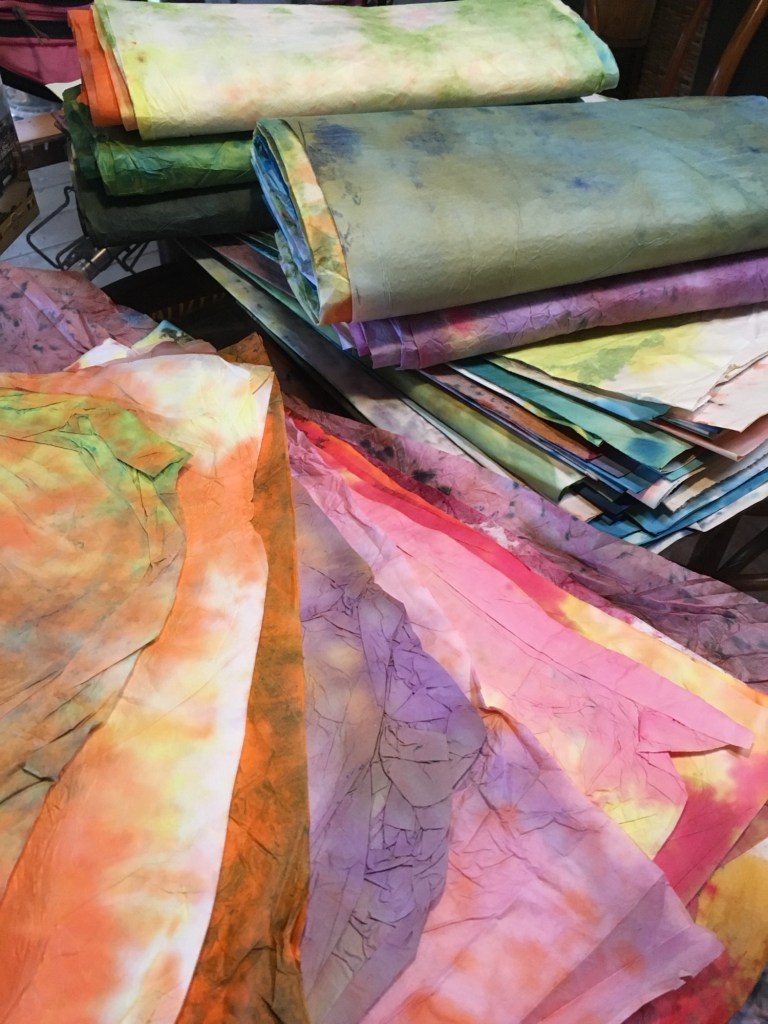 If you recall, the tissue paper that is slick on one side as for gift wrapping is dunked into a solution of silk screen dye, water, and an oil float for unique effects.