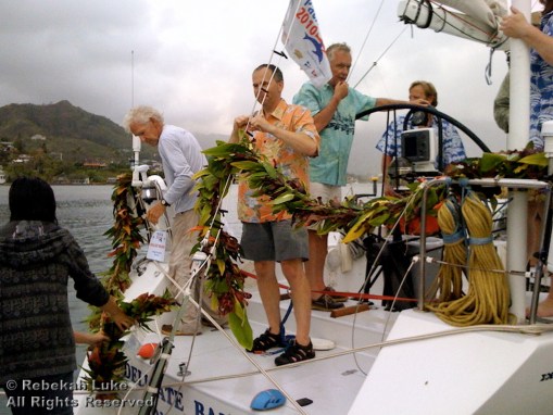DH and I were very short on sleep that year. Someone later suggested that we arrange for the Leis and Trays committee to deliver the lei. Brilliant! That committee is much larger and greets the boats with Hawaiian music, lei and mai tais for the captain and crew. Why not the lei for the boat too?