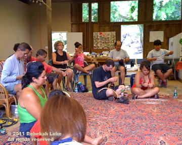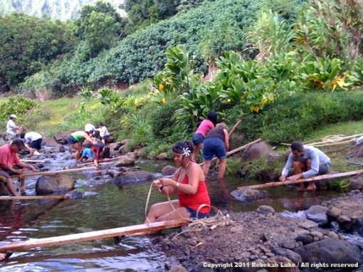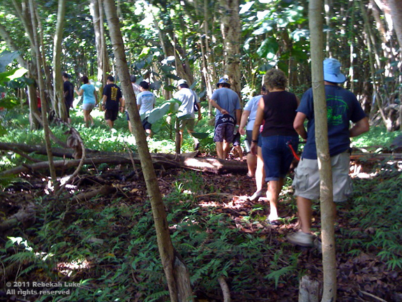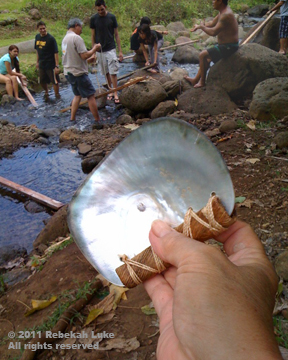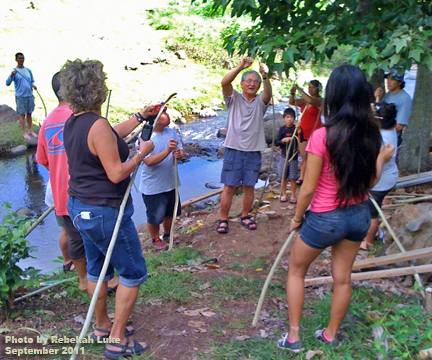 We gathered at Waipao, the site of Papahana Kuaola, on the banks of Haʻikū Stream on Oʻahu. The Papahana Kuaola organization is all about involving the community in environmental restoration and economic sustainability, while integrating native Hawaiian knowledge. Its activities center on cultural and natural history. It’s wonderful, pono (right), and maika‘i (good)!