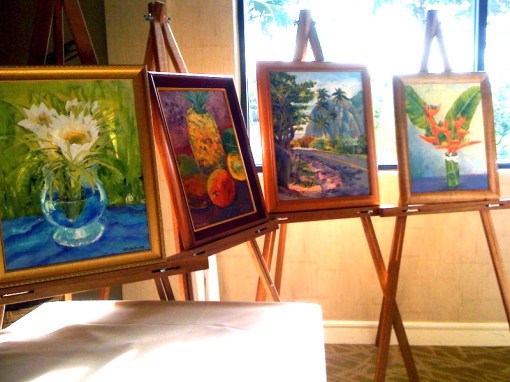 Good morning! It’s Day 4 at the Hawaiian Civic Club convention at the Turtle Bay Resort on the North Shore of Oahu, where I’m showing some of my paintings. It’s a hard sell against Aunty May’s banana bread, Kamakea’s colorful baubles, kulolo from Kauai, Makaweli poi, maile plants from Hawaii island, faux flower hair ornaments, yarn lei, and Aunty Phyllis’s Hawaiian print pillows — none of which are three figures like my oils!