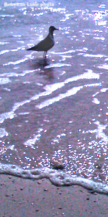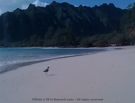 A lone kōlea — golden plover (Pluvialis) — seemed to be testing the water and thinking about a trans Pacific flight from Kaʻaʻawa beach to Alaska this morning. I pretended to be a nature photographer snapping many frames and hoping to get some good shots. Alas, nature photographer I am not, but I thought you would like to see what I made with DH’s iPhone as we walked the dogs. I applied the noise filter in Adobe Photoshop for the effect in the large photo.