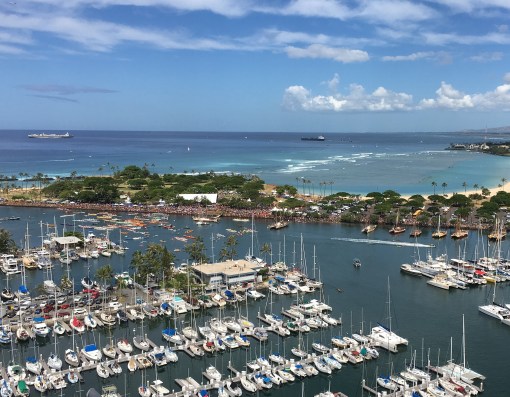 After visiting 23 countries and territories around the world over the past three years, the double-hulled sailing canoe Hōkūleʻa has returned to Hawaiʻi and was greeted yesterday at Magic Island, Ala Moana Park, Oahu, by an estimated 50,000 people. A friend and his wife invited me to their hotel suite 26 floors above for a bird’s eye view of the homecoming.