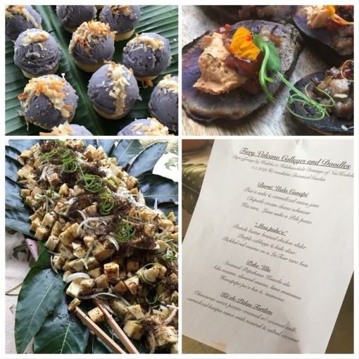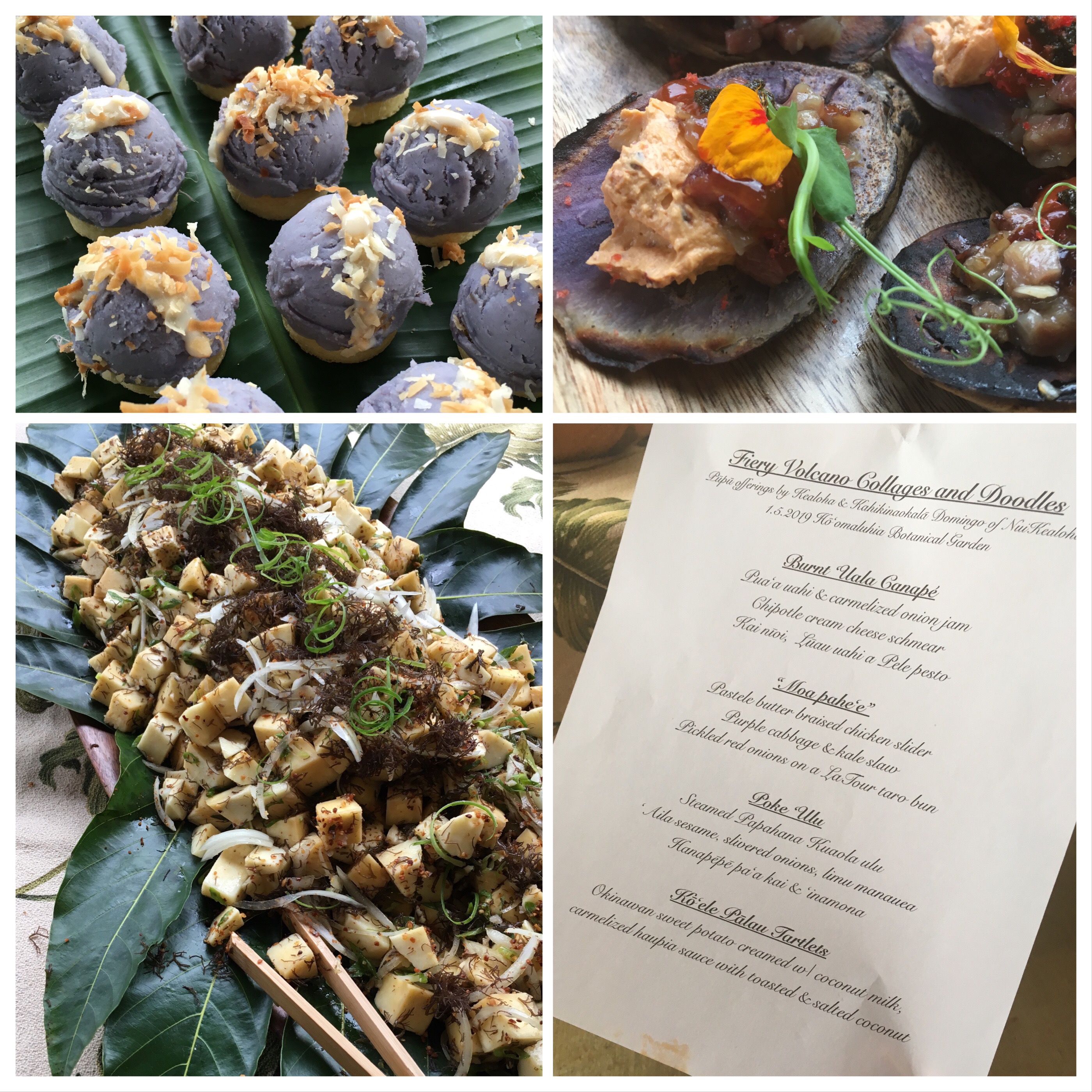 Clockwise from lower right: classy menu, poke ʻulu, burnt ʻuala canapé, koʻele pālau tartlets