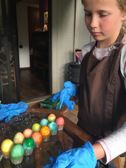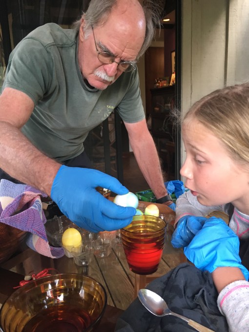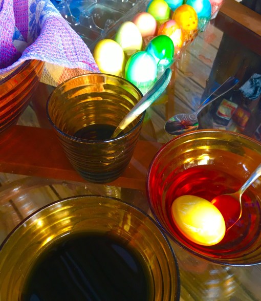 Our neighborhood is having a nighttime egg hunt on Good Friday, so Maundy Thursday’s secular activity was dyeing eggs—real hard-cooked chicken eggs.