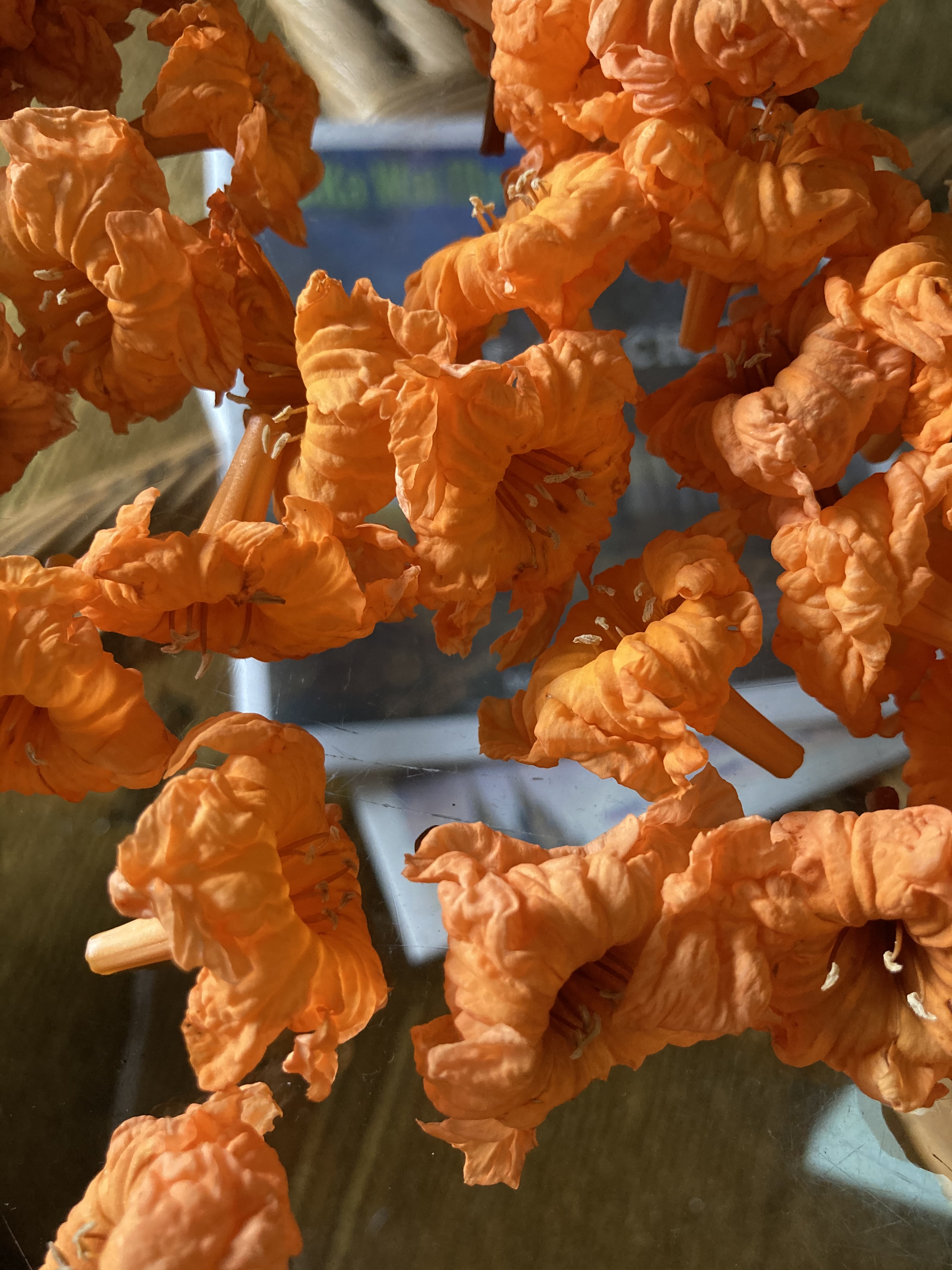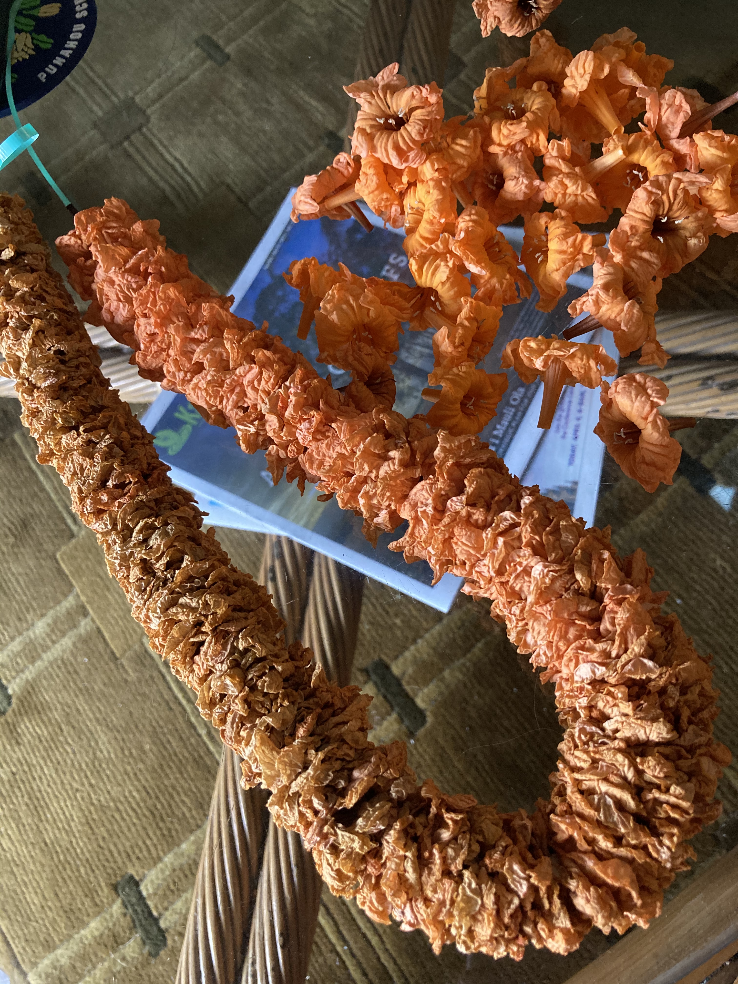 I string the blossoms into lei. You can see from the photos that over time their color fades into a rich burnt orange hue. When dried, the petals are almost like paper. I gathered the flowers for this particular lei over many days.