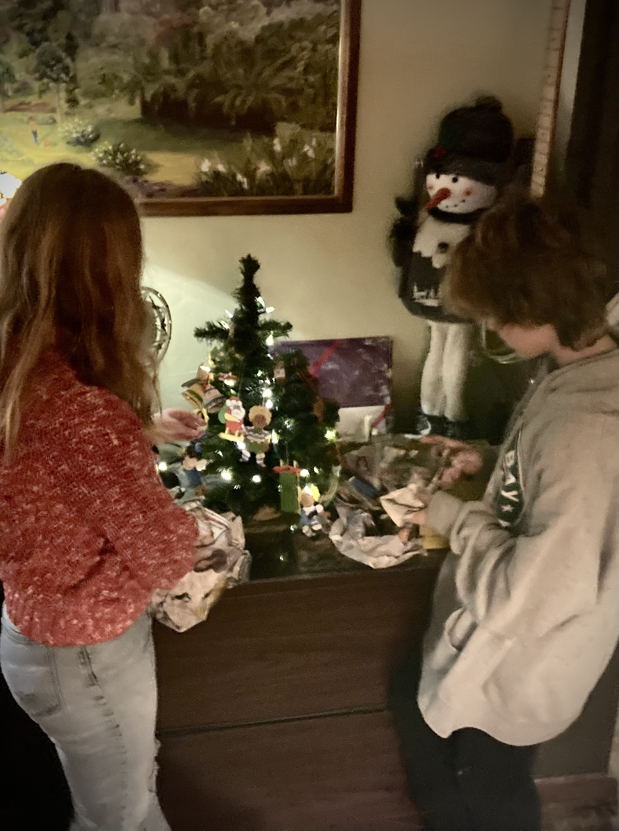 Our granddaughters trimming a small tree with ornaments hand made by their great grandfather.