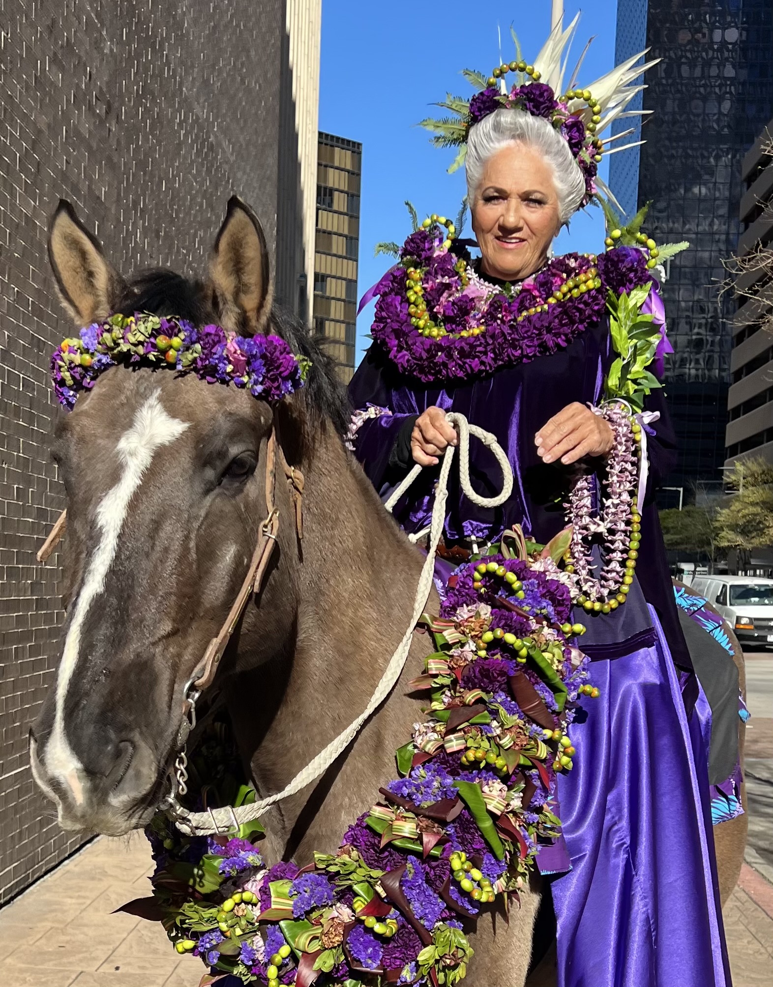 Fern White’s horse wears lei with red ti leaves. Feb. 2024. Houston, Texas. Lei by Gwendolyn Takeguchi.