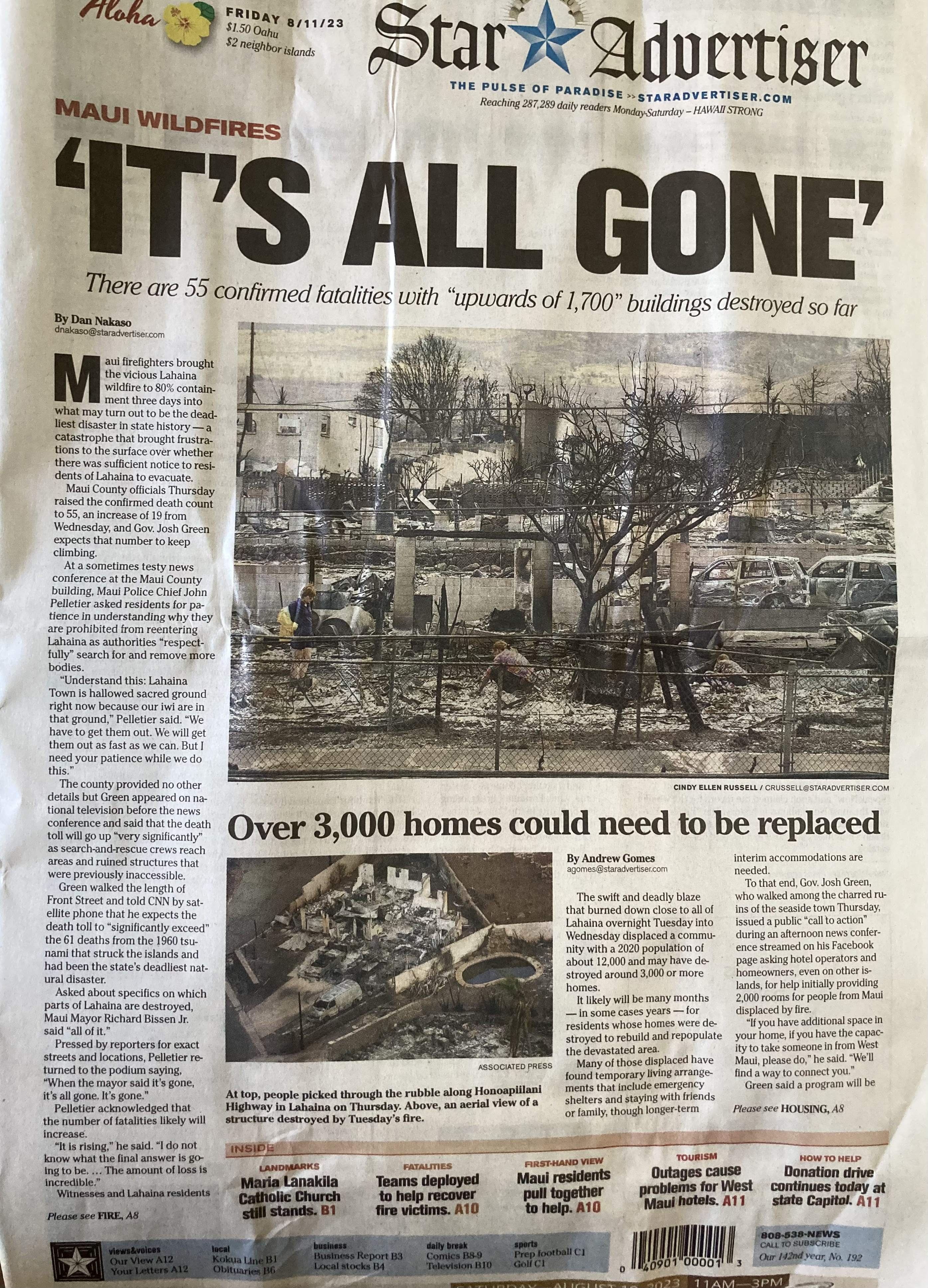 Wildfires this past Tuesday have destroyed most of Lahaina on the Island of Maui. I am writing this brief message to let you know that we at the studio, here on the different island of Oʻahu, are safe and saddened.
