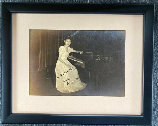 As a fine artist, I believe in displaying pictures in good frames. Recently, my cousin Titus gave me a photograph of my mother at a Steinway piano. I already have a similar one from the same shoot of her facing the keyboard. In the one Titus gave me, she is facing the camera, and she signed it!