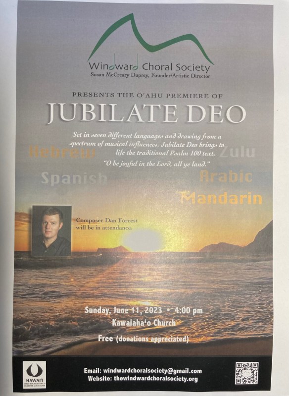 The sanctuary of Kawaiahaʻo Church filled with concert goers yesterday to hear “Jubilate Deo,” a choral and symphonic work composed by Dan Forrest, and performed by the Windward Choral Society and symphony musicians under the direction of Susan McCreary Duprey. What an honor and a pleasure!