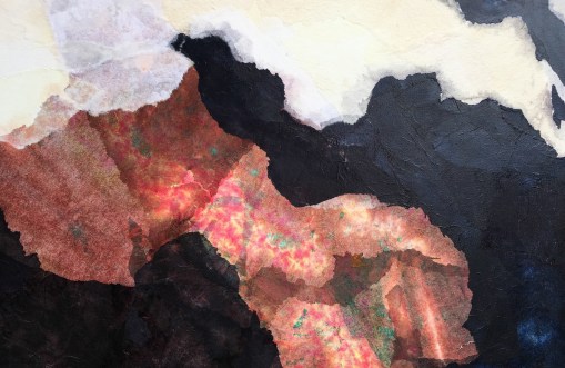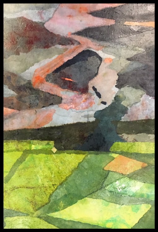 40” x 30” both panels of diptych. Hand-dyed tissue paper collage. $900. each of two. The right panel has been resized to a square. Volcano series by Rebekah Luke