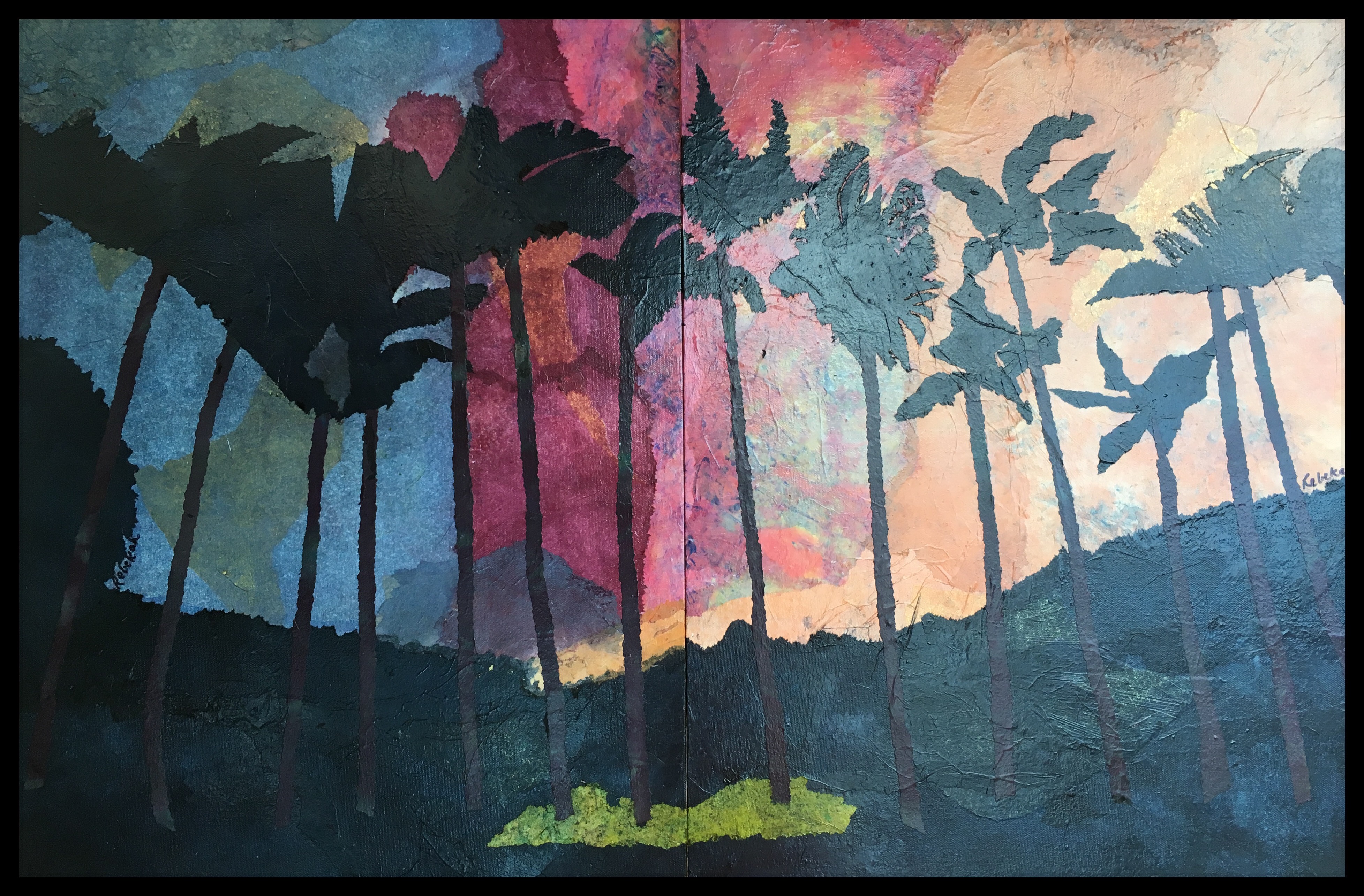 COCONUT TREES BACKLIT BY VOLCNIC GLOW (After Dennis Oda)—Volcano Series Diptych