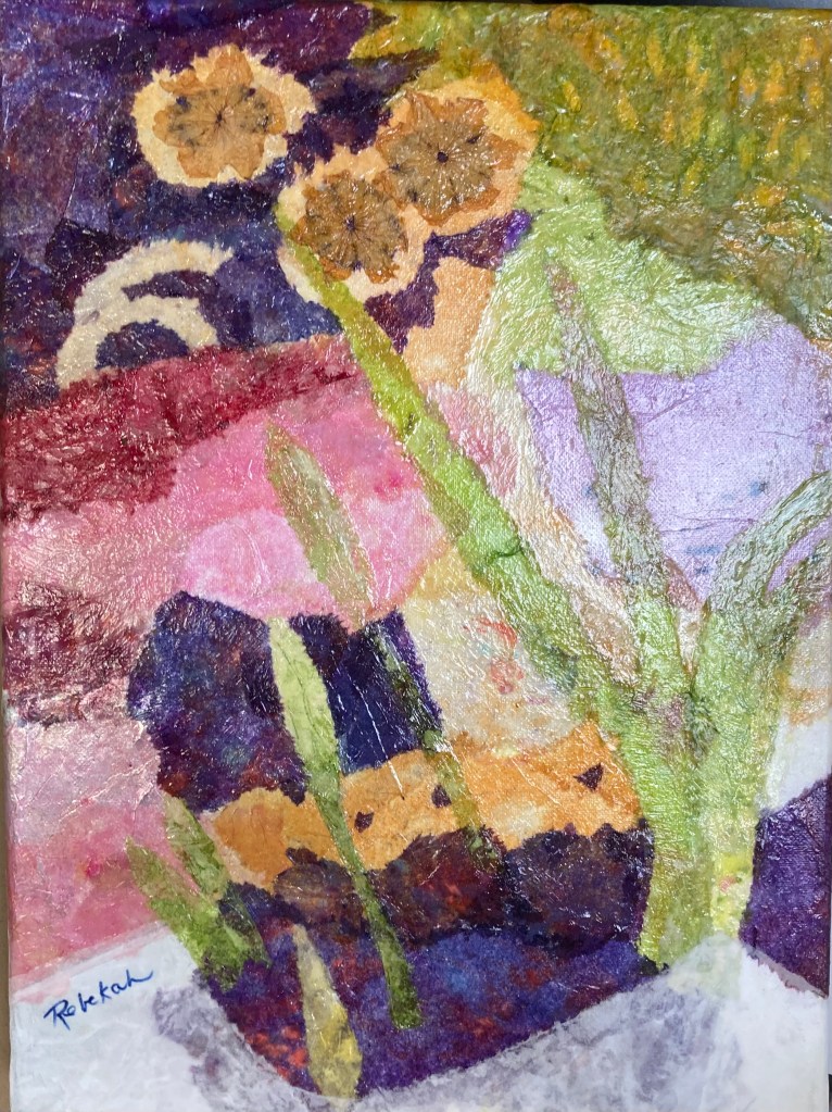 In 2014 at 65 I was honored to deliver a commission that was a collaboration of visual ideas between me and the patron. Starting 2015 I began making collages with hand-dyed tissue paper. — Rebekah Luke