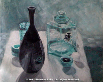 The painting. Monochromatic color lesson: adding one hue only, veridian, to black and white, still mindful of the range of values, that is, the various tints and shades of gray. Lesson includes painting glass.