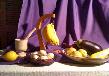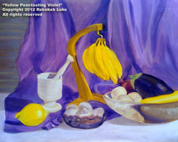 The set. The complements yellow and violet mix to make warm tans and browns. Of light rays passing through a prism, yellow is the lightest value, and violet is the darkest. This still life set introduces drapery.