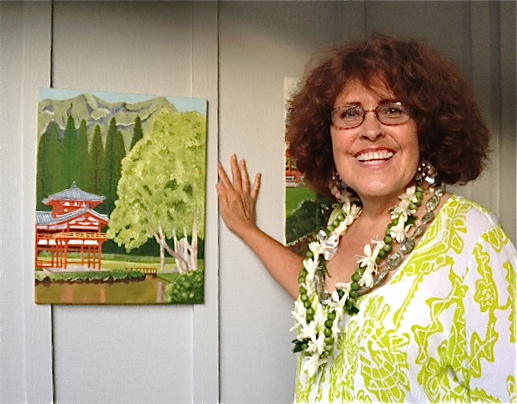 Linda Haynes Abbott with her artwork of Byodo-In at Kahalu‘u, a favorite location to paint en plein air (Jan McEwan photo)