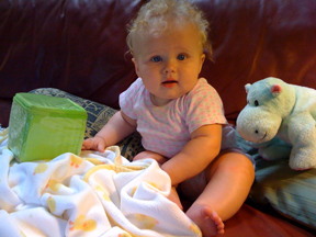 I placed manipulatives—the correct name for these age-appropriate toys, I learned—in front of her, slightly out of her reach, as an incentive. One of them was a soft cuddly hippopotamus named Hillary who she loves and responds to.