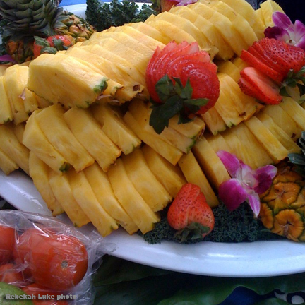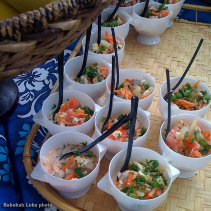 The couple’s Tahitian friend Ramine, who hosted and fed them in the South Pacific in the manner you see in my photos, came to O‘ahu and prepared a gastronomic spread that was the highlight of a colorful thatched-roof “tiki bar” setting that Lori and her friends decorated with pareu (sarong wraps), vanilla orchid, lei po‘o, coconuts, big tropical flowers, and shredded ti leaves (Tahitian-style fly swatters). Lori passed out tiare blossoms for the welcome wishers to wear over their ears.