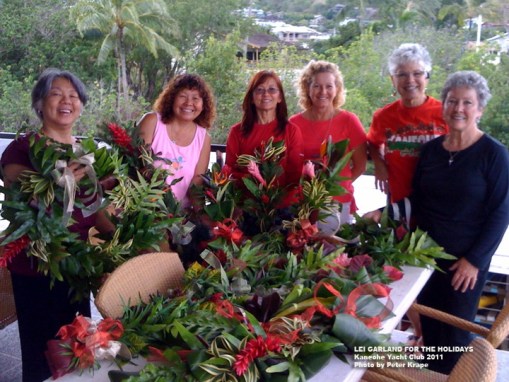 In Hawaii we are fortunate to grow gardens with flowers and foliage to decorate our homes and adorn ourselves the year ’round. I’ve started to show others how to craft holiday garlands, such as Christmas wreaths, table centerpieces, hostess gifts, and swags.