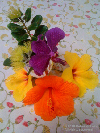 Kathryn's bouquet from her garden—yellow lehua, a vanda orchid, and hibiscus