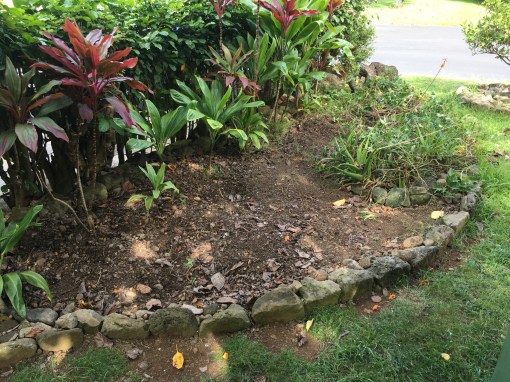 Today I pulled out 7-1/2 pounds of ‘uala, or sweet potatoes, of various shapes and sizes from the semi-circular patch out front. At the same time I plucked and saved the edible tender sweet potato leaf shoots. I rinsed and dried the greens and reserved them for sandwiches and salads.