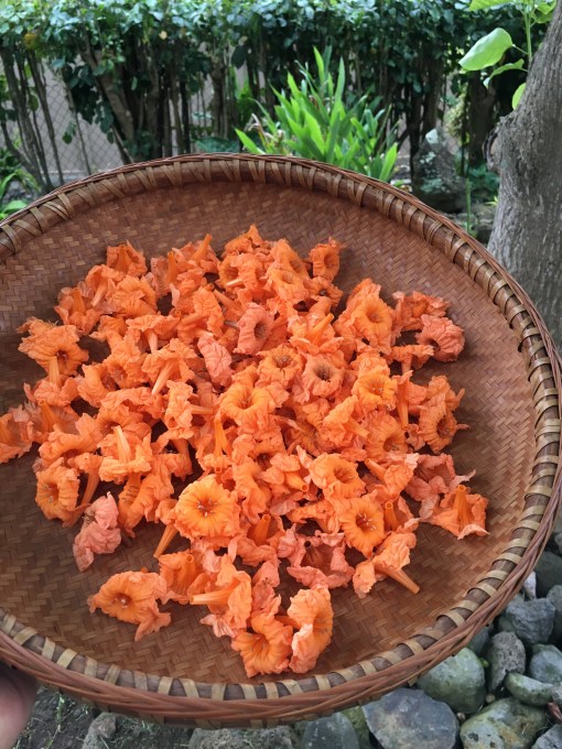 What now? I prepared candied sweet potatoes and an uala leaf and tofu salad for dinner, and I reserved the kou flowers for later when I can organize a day of fabric dyeing and decorating with my artsy friends.
