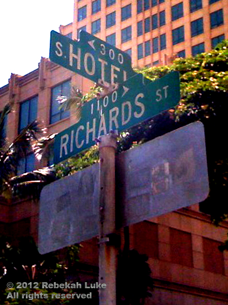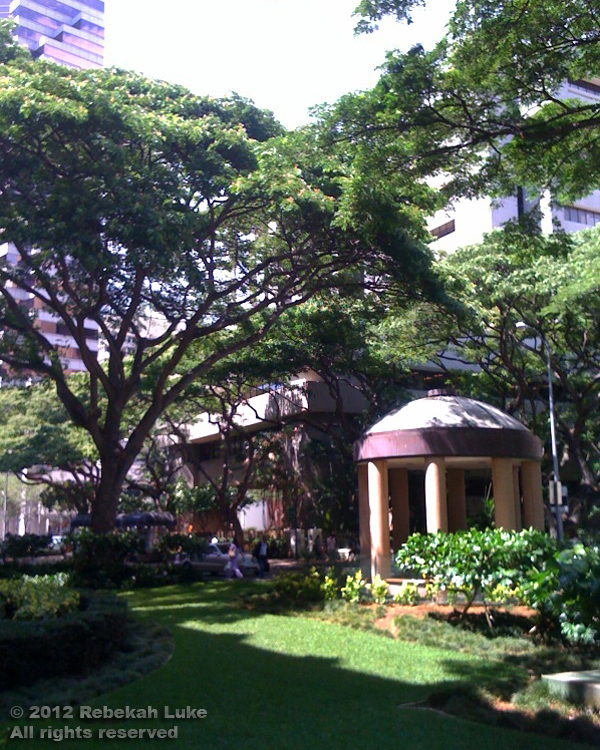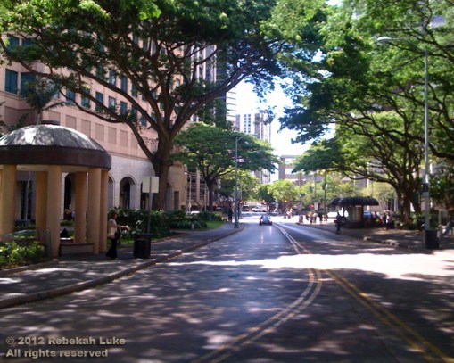 Approaching the intersection of Hotel and Richards, the loveliness of dappled sunlight through the monkeypod trees stopped me. Pause for photos.