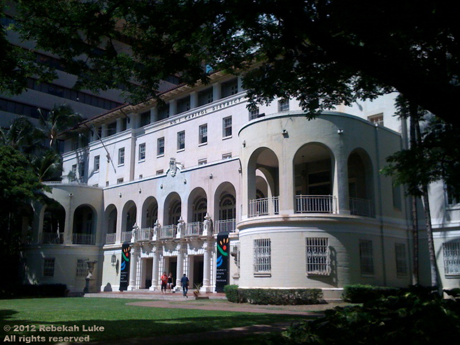 When I was in my twenties, I came to the Armed Services YMCA once a week to rehearse with the Honolulu Chorale. In 1927-28 that building was erected to replace the second building of the original Royal Hawaiian Hotel (Hotel Street was named in 1850; the original hotel was demolished in 1882 and rebuilt). I thought it was grand as a functioning Y and imagined what it must have been like in its heyday. Today the building is renovated, housing State offices and the Hawai‘i State Art Museum on the second floor, my destination.
