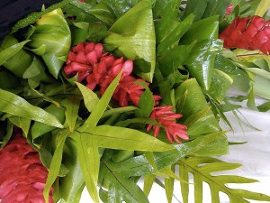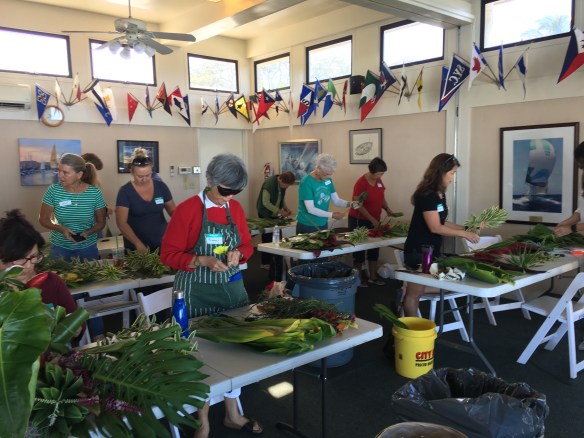 In more recent years, I have partnered with Koolauloa Hawaiian Civic Club to supply the boat lei. Volunteer members and friends gather the plant material from their gardens and from the mountains, donating the material and their time to the project. Other members and friends, who are artistic and enjoy lei making, work professionally as floral designers for a few days and assemble the lei. The net proceeds from the sale of the lei provide scholarships for Native Hawaiian club members and/or their children.