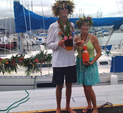 DH and I were very short on sleep that year. Someone later suggested that we arrange for the Leis and Trays committee to deliver the lei. Brilliant! That committee is much larger and greets the boats with Hawaiian music, lei and mai tais for the captain and crew. Why not the lei for the boat too?