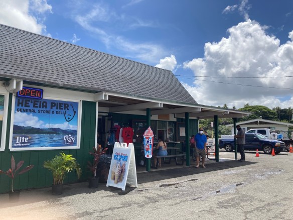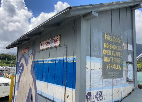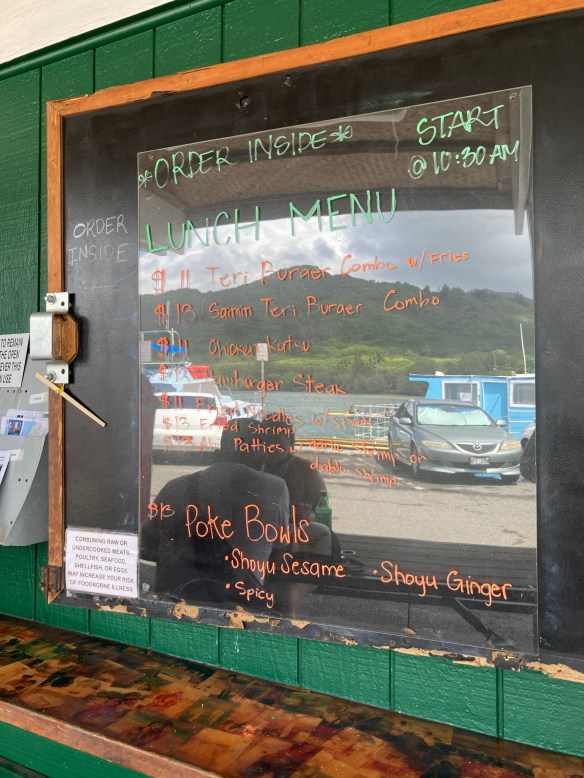 After the pool and some errands, I swung by Heeia Pier for lunch and scored a good parking place, step one. The place has become popular with the breakfast/lunch crowd, and sometimes I have to park on the far side of the boat ramp. Looking at the menu board and considering food choices and my lack of cash — pay day for me is tomorrow, and I robbed my parking meter fund of quarters today — I picked “stir-fried veggies” for $3 and an honest cup of coffee for 50 cents.