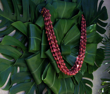 My friends Kamakea and Kai who come from a long family line of Hawaiian lei makers made these blue marble lei in the next photo to look like jewelry. I saw them for sale at last Saturday’s hoolaulea at Hauula Elementary School. Hawaiians use all sorts of natural plant materials, not just flowers, to adorn themselves. What looks like carved round Oriental wood beads is actually the inside of a blue marble (Elaeocarpus grandis) fruit.