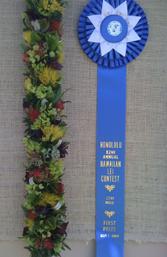 Last year’s 2009 grand prize winner was a drape of many strands of plumeria buds cleverly snipped and strung kui style. So simple, but different, and what an elegant statement!