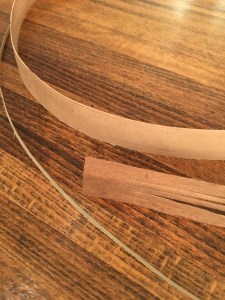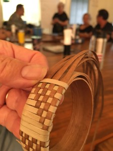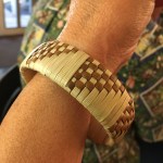 Kumu provided kits of the materials, having already done the hard part for us—gathering, cleaning, cutting off the thorns, stripping, and softening the lau hala. The kit included 1) a backing that we wound around all five knuckles that our bracelet would have to pass over, 2) a dark-colored warp already stripped into seven quarter-inch widths (see photo) starting about one inch from one end, and 3) a whitish-colored weft.