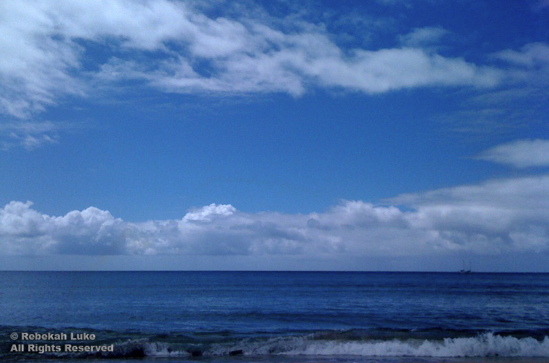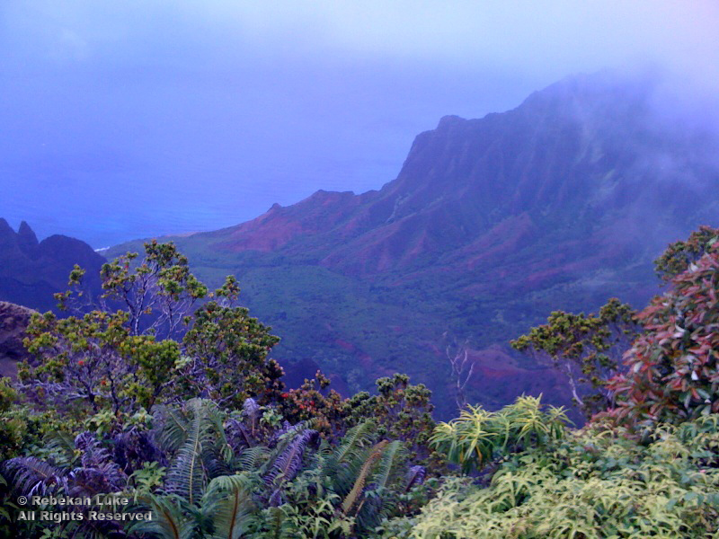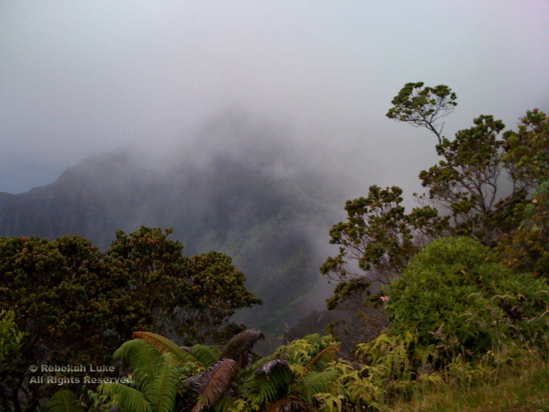 In the clouds. When we arrived at the ma uka lookout to Kalalau Valley, we looked out to a sea of white, waiting patiently until the clouds lifted to reveal the valley and the surf far below (see top photo)