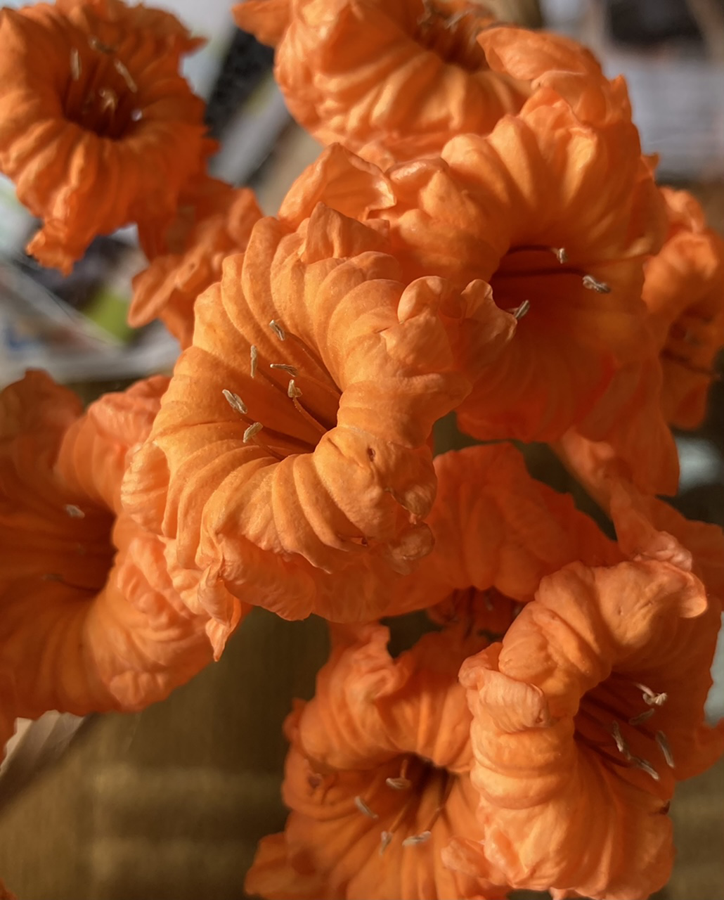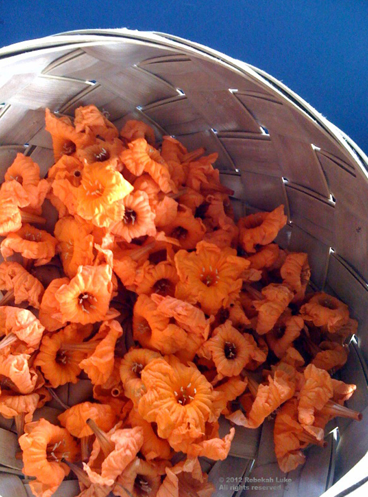 The kou tree in the front garden is blooming and dropping delicate orange-colored blossoms. When strung into a flower lei they look like ilima.