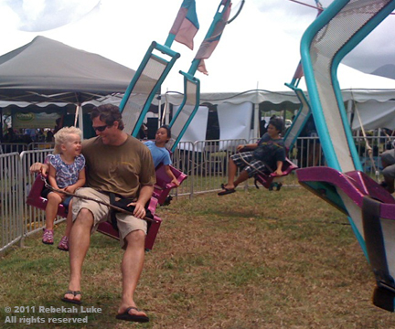 For the small kiddies there were the ubiquitous inflatable bouncies, horseback rides, and a couple of carnival rides. Before we left, Miss Marvelous and her dad had to spend their tickets one one last ride.