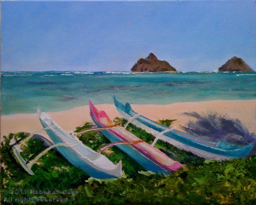 11 04 2011This is my finished painting of Lanikai Beach on Oahu. Oil on canvas. Each panel measures 20″ wide x 16″ high prior to framing. Beach goers are familiar with the iconic outrigger canoes, twin islands, and shady palms. This is the scene from Karl-and-Julie’s. I can’t wait for them to see it. © 2011 Rebekah Luke / All rights reserved