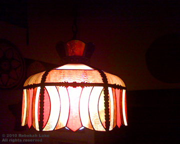 I let the idea go. DH went back to “recycled” mode and started searching on eBay. How about this? No. Well then, what about this one? Nuh-uh. Oh, he was patient! Finally he showed me the pictures of a lamp that seemed to “go” with the house. It was old, but in good shape and pretty. It would be a design repeat of a few other pieces of art glass we had. And the caramel, chocolate, and orange in the shade picked up on existing colors in the room. Okay! I said.