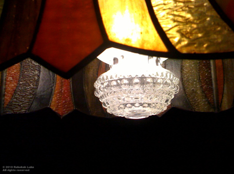I tried to ignore the eyesore while DH offered alternatives. He is into eco- and energy-efficient lighting, while I am partial to the old-fashioned and energy-hoggy incandescent types. At nighttime, the whole of our living space is lighted with a seriously eclectic collection of table lamps, from heirlooms to silent auction prizes to Ross store bargains.
