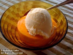 Recipe: Run a knife around the waist of the fruit (NOT through the stem end), twist apart into halves, twist pit to remove (over the sink, eat pulp around seed before discarding), fill cavity with vanilla ice cream. Enjoy immediately. Mmmm, good.