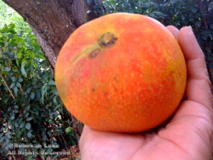 Oh joy! I found a gift in the healing space and turned it into a refreshing summer treat. A similar thing happened last season, about the time I launched this blog. I was thinking to myself, “I’m hungry,” when I glanced in the garden and saw one luscious fruit on the ground. Its name is Hayden (or Haden). Mahalo e ke Akua!