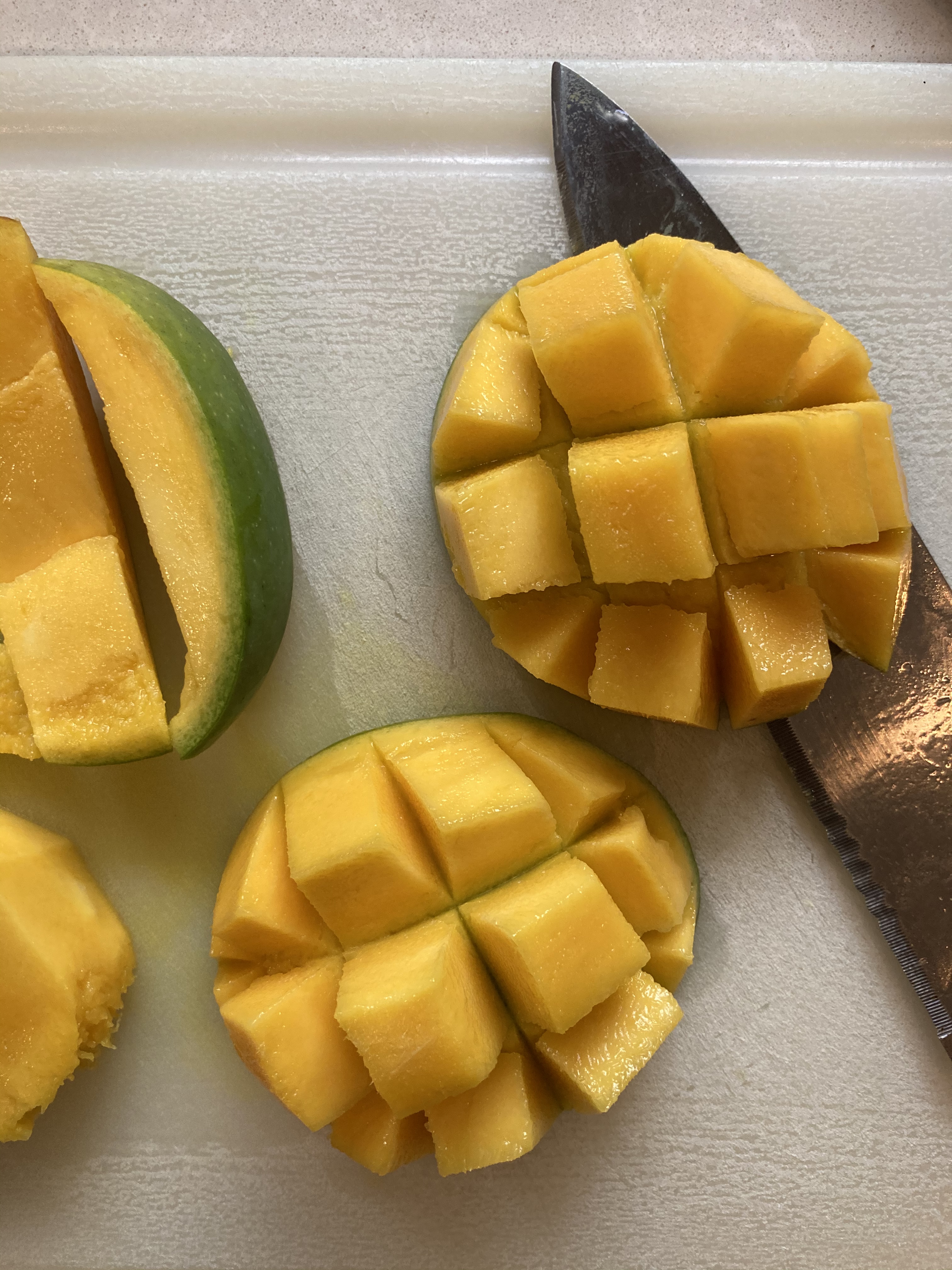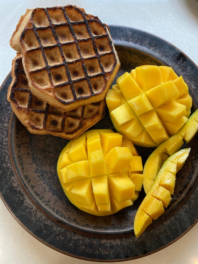 Mango season has begun, and I can’t wait until it’s full on. This is how I like to prepare the fruit for eating. See the design repeat of the waffles?