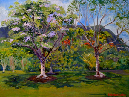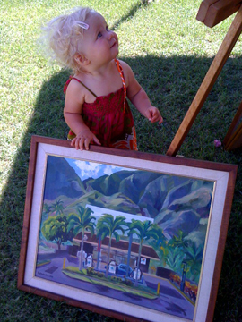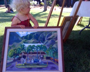 The afternoon of day 2 of the Native Hawaiian Arts Market in Honolulu. Many visitors to the Bishop Museum have stopped by the display of my landscape paintings and admired them, but no sales. The sky is threatening thunder showers, and DH who is my “easel” is hinting to pack up.