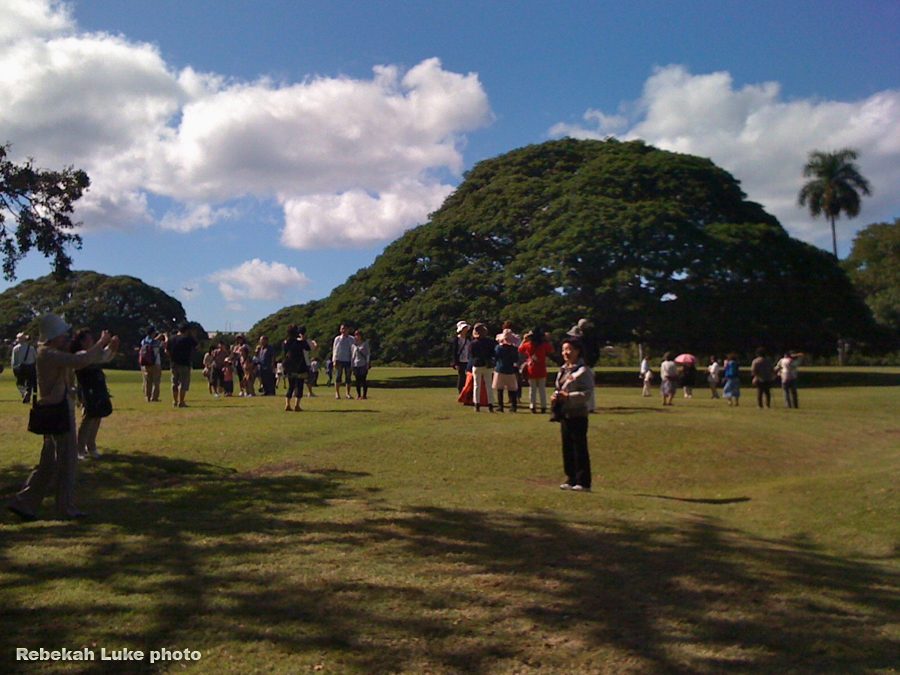 On three outings there this month, while busloads of Japanese tourists came to photograph the famous Hitachi tree (Hitachi, Ltd. pays for the rights to use the image of the grand, old monkeypod tree as its logo), while the gardeners operated their loud maintenance equipment, and while the elementary school children next door enjoyed their recess, I could still find my zone to paint the hula pā, romantically back-lit by the morning sun.