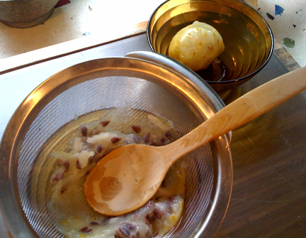 I use a wooden spoon to press the ripe noni through a metal sieve into a glass container, separating all of those seeds from the pulp