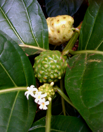 Noni (Morinda citrifolia) in three stages, bottom to top: flowering, green, almost ripe. Try the tiny white flowers for breakfast or as a garnish on salads.