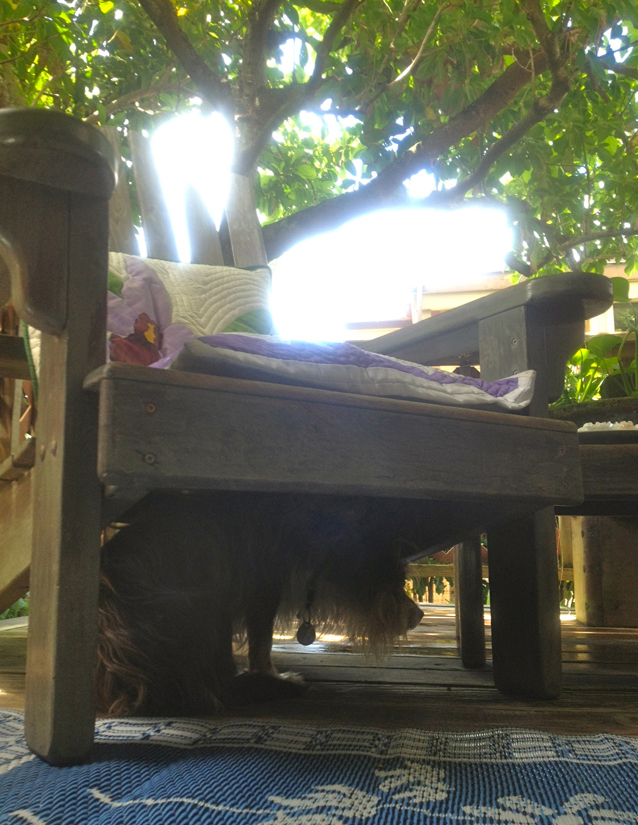 This morning I tended the basil, pinching off the flowers from most of the sweet herb because I want to use it instead of letting it go to seed. I left some of the flowers on the plant for the bees. Everyday I check the side yard to see if any of the avocados from my neighbor’s tree have fallen, and to pick up and toss old breadfruit leaves from the ground. I strip off the bottom layer of all the ti leaf plants that I’ve cultivated mostly to make lei. The kou tree, planted for its shade and orange lei flowers, makes a lot of rubbish with its palm-size leaves and ball-bearing-like seeds, so there’s raking to do. Looking up, I see the avocado tree is finally flowering!