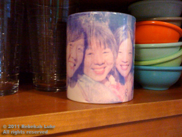 Mugshot, literally. From left, Chalida, me, and Lisa. A souvenir, with patina from the dishwasher, from Linda's birthday. We're modeling lipstick for Lisa's upcoming wedding.