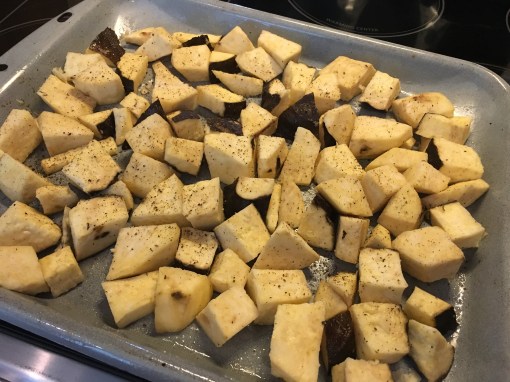 I roasted sweet potato chunks in the oven and baked them a second time with butter, a little salt, brown sugar, and rum to make them taste like Thanksgiving candied yams!